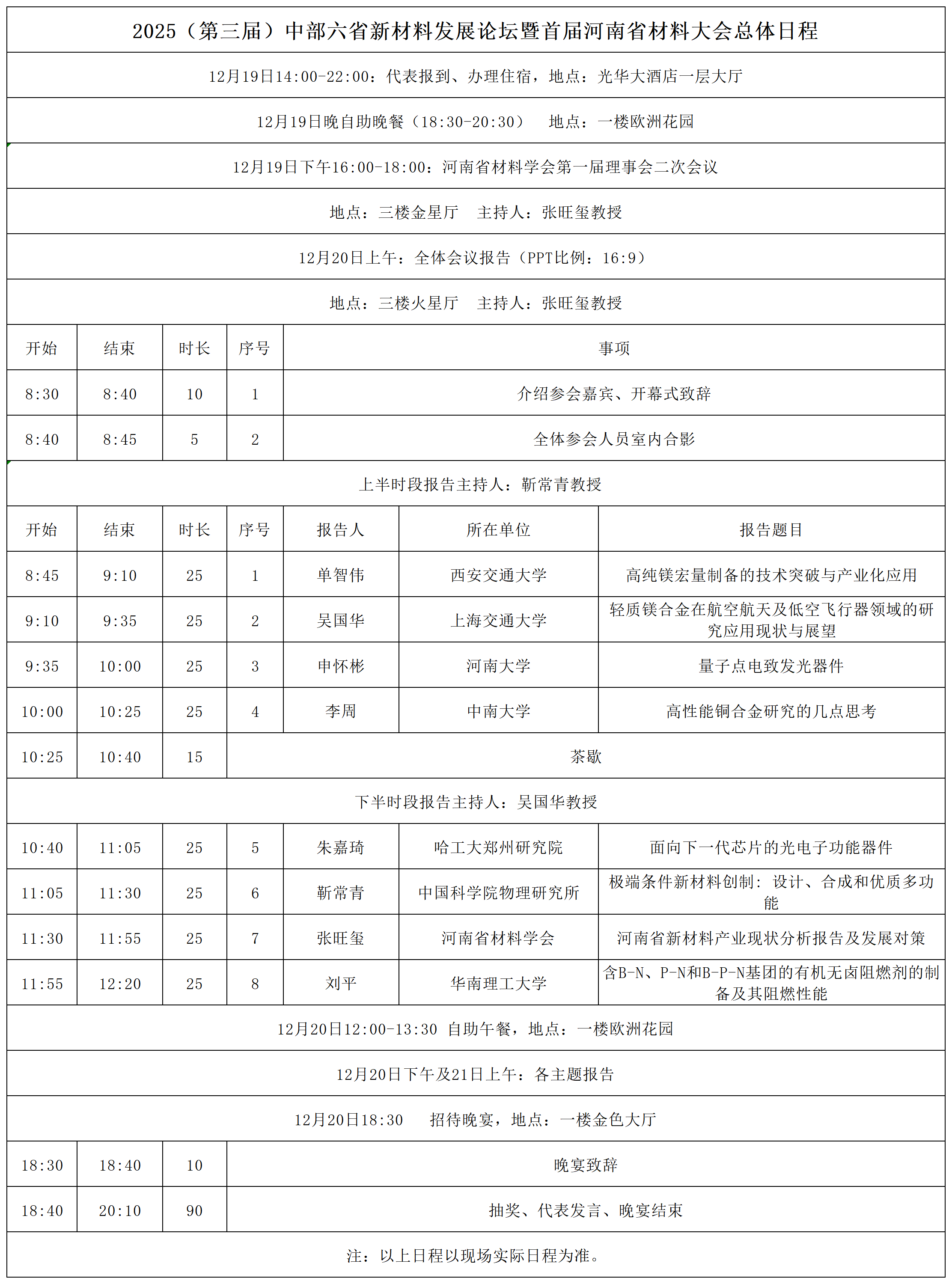 各位参会代表:2025(第三届)中部六省新材料发展论坛暨首届河南省材料大会将于12月19日-21日(19日报到)在河南郑州举办,以下为论坛日程,请您参考。日程可能与实际有所出入,具体日程均以论坛召开时实际日程为准。