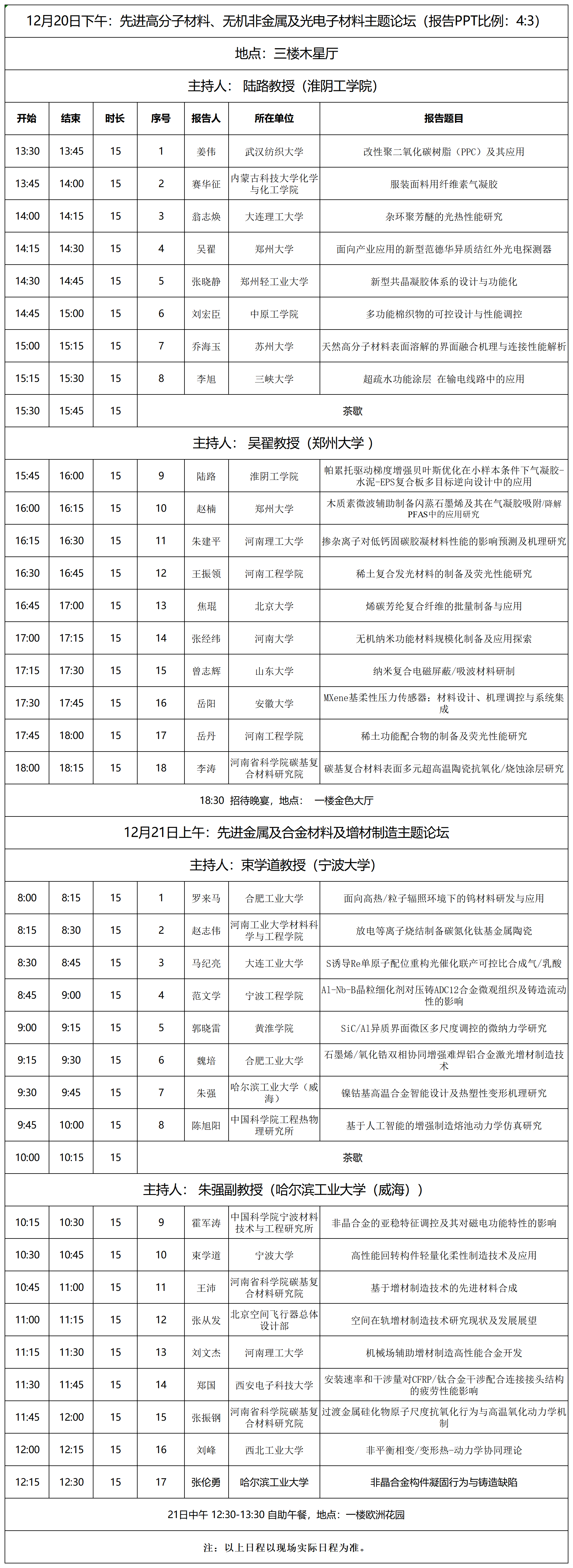12月20日下午及21日上午:先进高分子材料、无机非金属、光电子材料、先进金属及合金材料及增材制造主题论坛